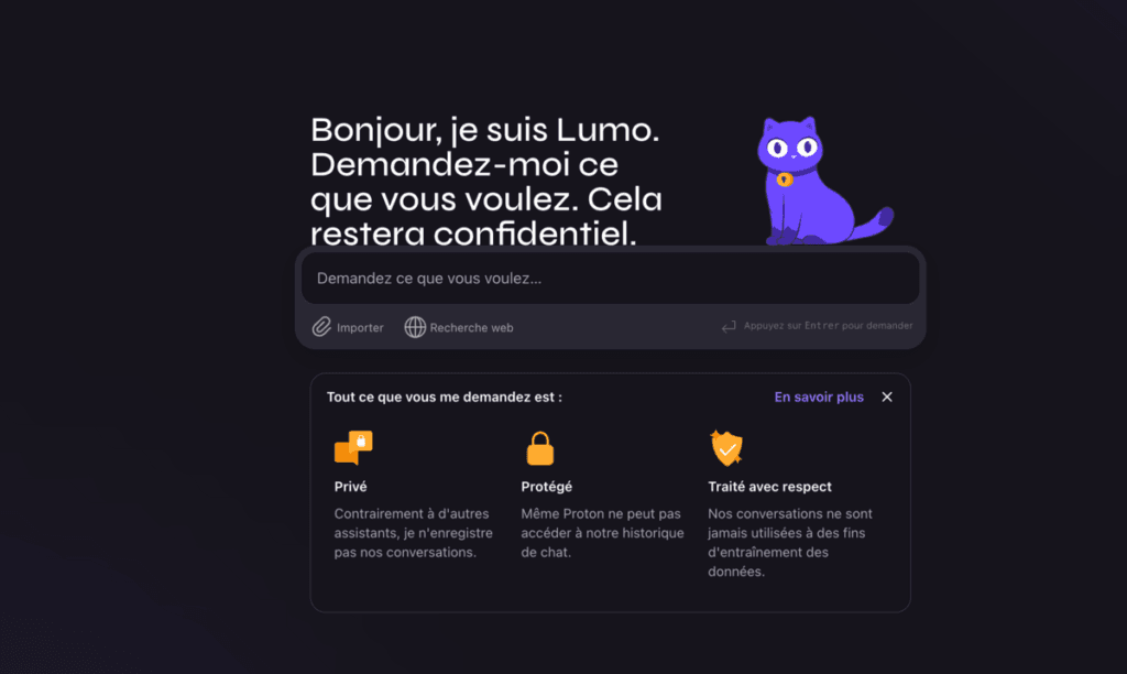 - Pour qui ? professionnels et particuliers qui valorisent la confidentialité maximale grâce au chiffrement zero‑access, surtout ceux déjà clients de Proton (Mail, Drive, VPN) ou des organisations qui interdisent ChatGPT pour des raisons de conformité.