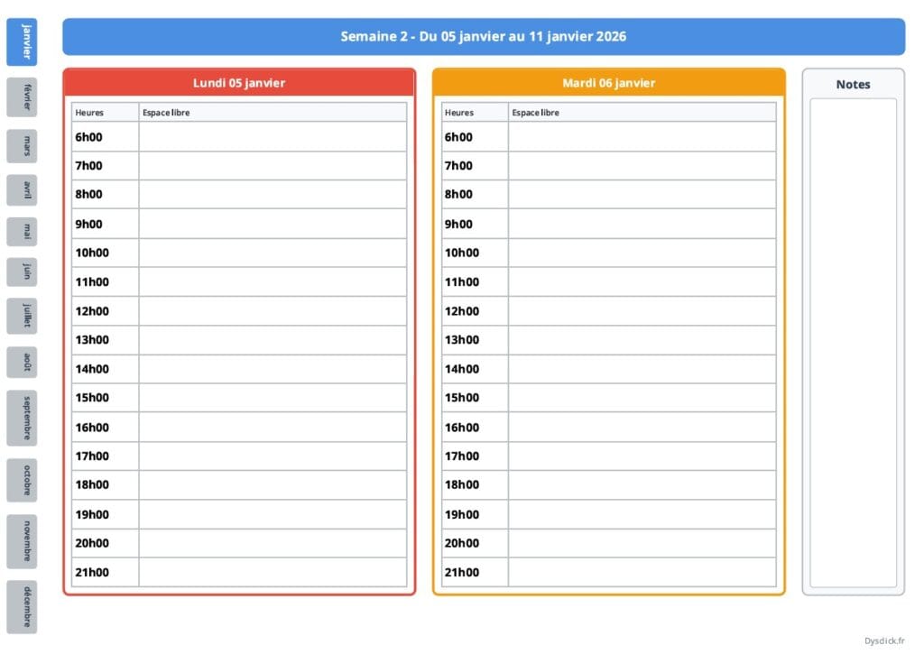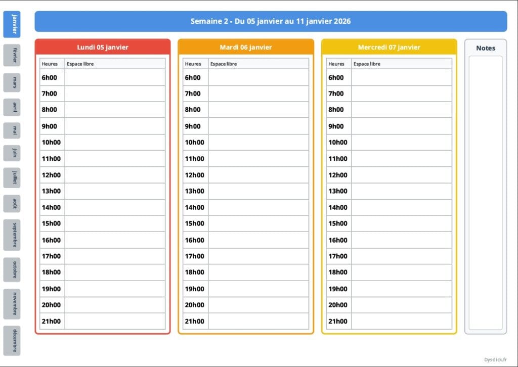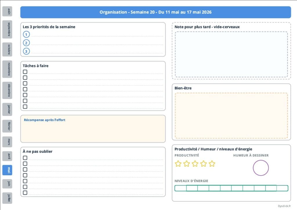 - Mise en page ultra claire : Repères visuels nets, grandes zones d’écriture, codes couleurs réguliers. On limite au maximum le “bruit visuel” qui fatigue le cerveau.