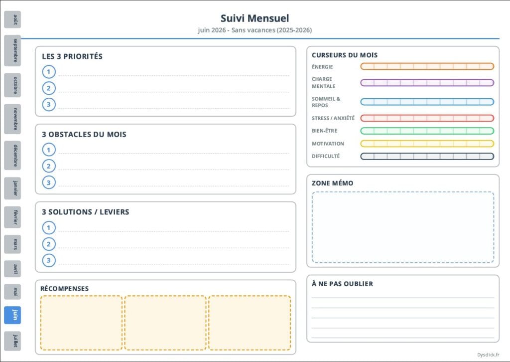 - Des curseurs visuels pour suivre : énergie, charge mentale, sommeil / repos, stress / anxiété, bien-être, motivation, difficulté globale du mois