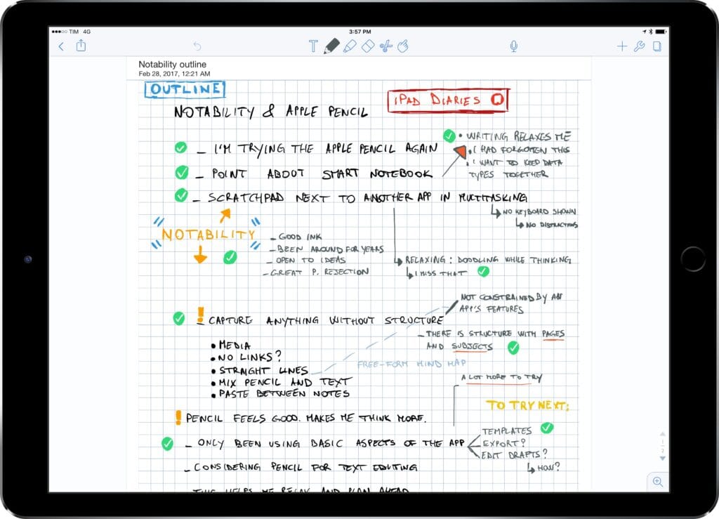 Notability – Gratuit (avec options Premium à 20€/ans), Âge : collège, lycée, supérieur. Application polyvalente de prise de notes multimédia : on peut taper du texte au clavier, écrire à la main (compatible Apple Pencil), annoter des PDF et enregistrer l’audio en simultané. Idéale pour élèves DYS, Notability intègre un correcteur orthographique et permet d’attacher des documents scannés ou des images aux notes. Les enregistrements sont synchronisés avec les notes écrites, facilitant la relecture. Atouts DYS/TND : interface épurée, organisation par carnets, recherche dans les notes, compatibilité VoiceOver et usage hors-ligne une fois les notes synchronisées.
