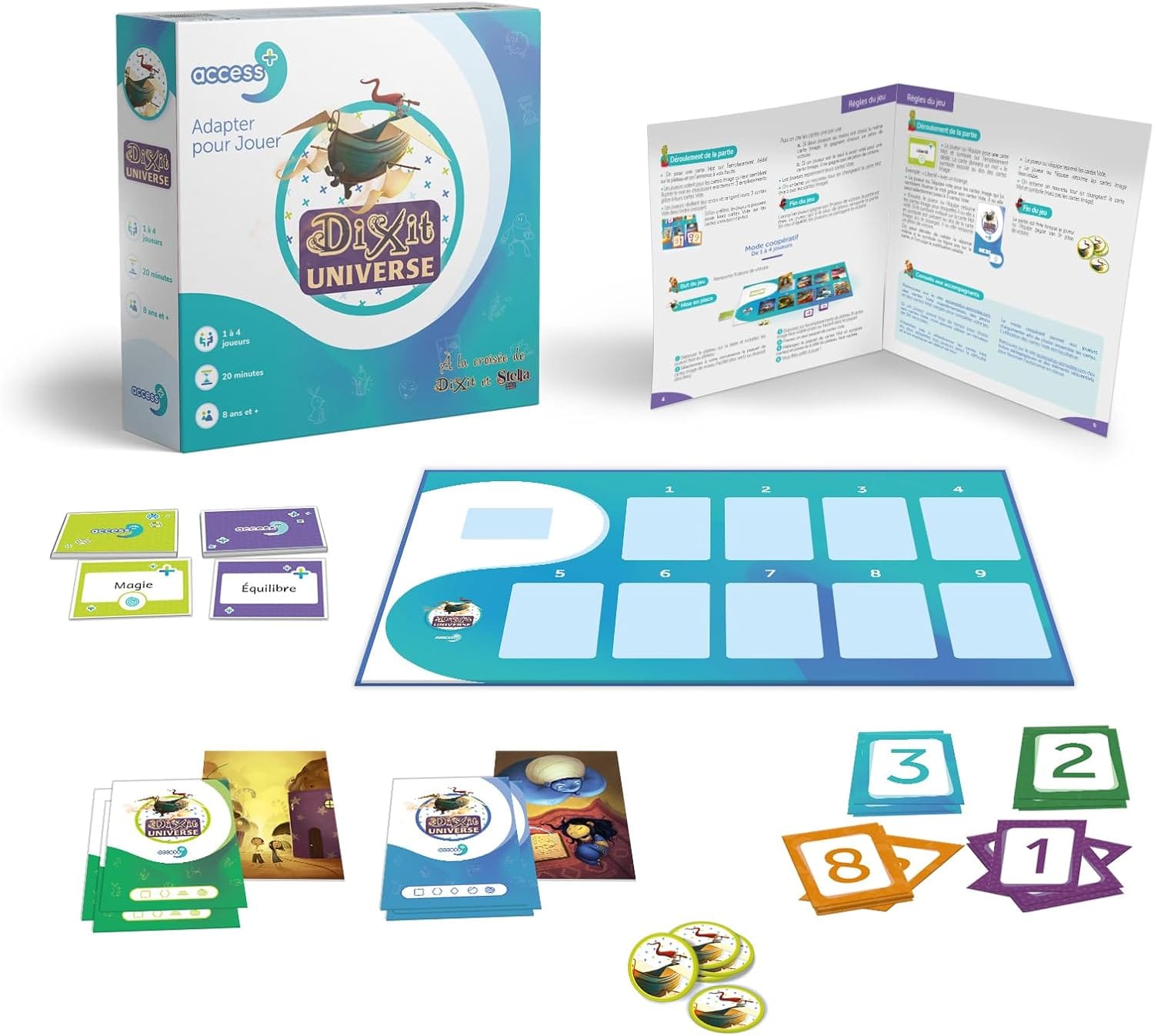 - Fonctions stimulées : Dixit Universe Access + sollicite la parole, l’imagerie mentale et la mémoire à court terme. Les illustrations oniriques encouragent l’expression orale et la créativité, ce qui peut aider les personnes dysphasiques à pratiquer le langage dans un contexte ludique. La présence de modes coopératifs réduit la pression compétitive et favorise la collaboration, bénéfique pour les enfants dyslexiques ou dyspraxiques qui peuvent s’appuyer sur les autres joueurs.