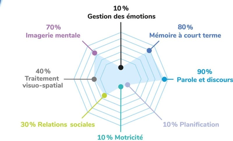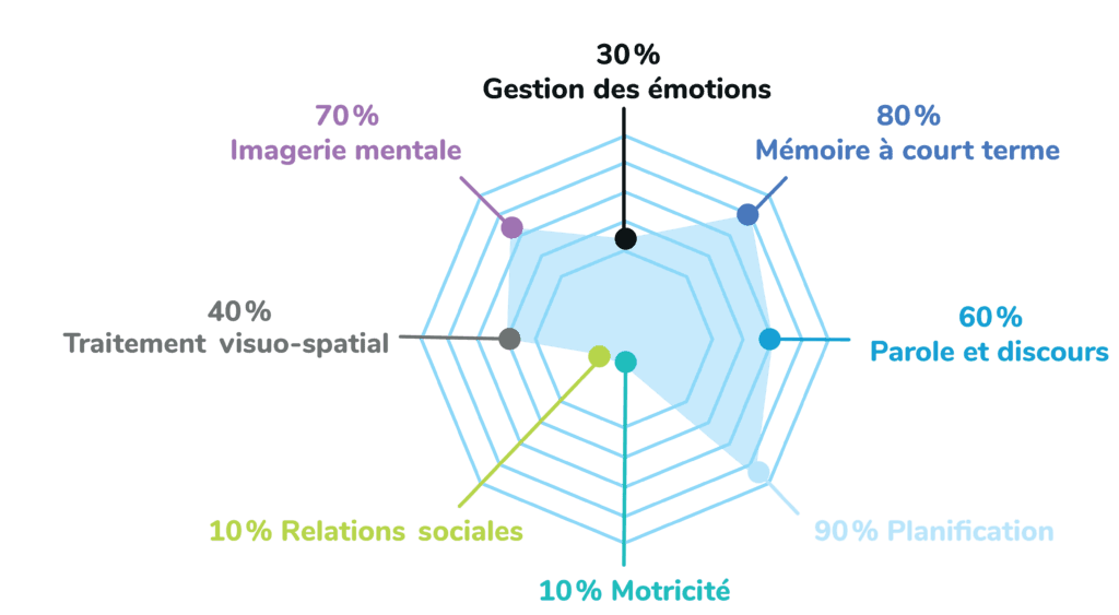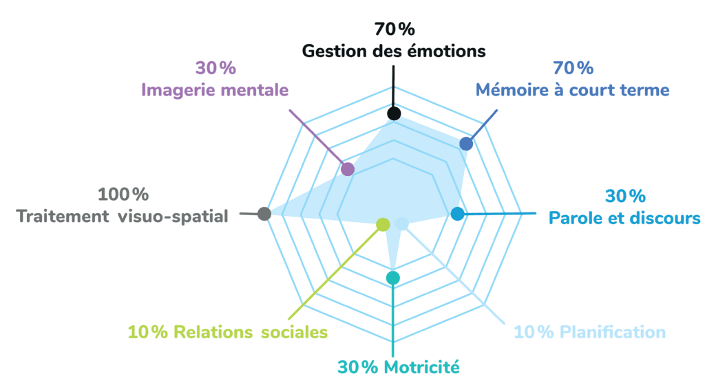 Dyspraxie : La dyspraxie rend les gestes précis difficiles et la manipulation des petites cartes ou pions peut décourager. Access + répond à cette contrainte en proposant des cartes plus grandes et plus rigides. Les symboles agrandis et les supports tactiles améliorent la reconnaissance visuelle et limitent les manipulations compliquées. Les parties courtes de 10 à 20 minutes respectent la fatigue motrice et cognitive.