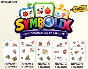 Un jeu rapide à sortir, sans écran, pour faire jouer tout le monde : Symbolix Noël (type Dobble) en PDF gratuit. 5 niveaux progressifs (3 à 8 symboles) pour s’adapter aux enfants, ados, adultes, y compris avec des besoins TND (DYS, TDAH, TSA). Cartes en planches de 6 à découper, règles incluses, modes rapide, tour par tour ou coopératif. Laisse ton email dans le formulaire et reçois le lien. Tu veux quel thème pour le prochain pack ?