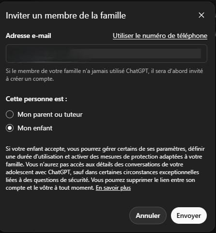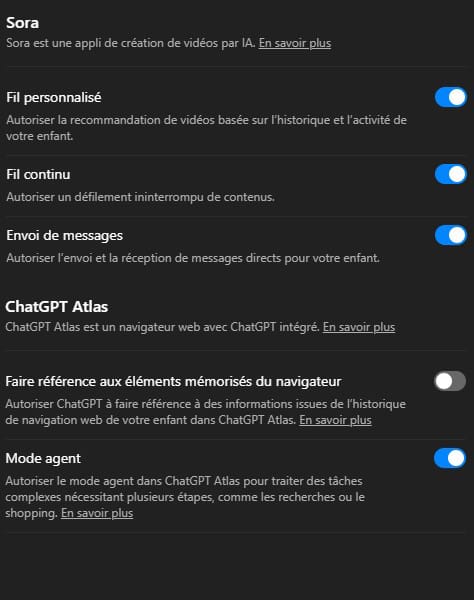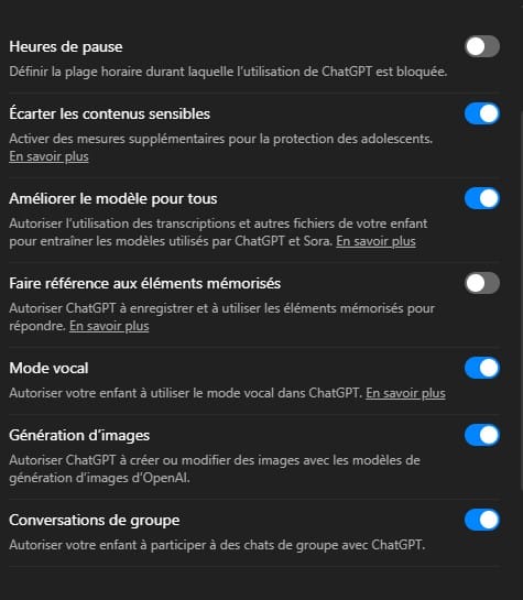 Dans l’interface de ChatGPT, la section “Contrôle parental” permet de gérer une belle palette de paramètres :