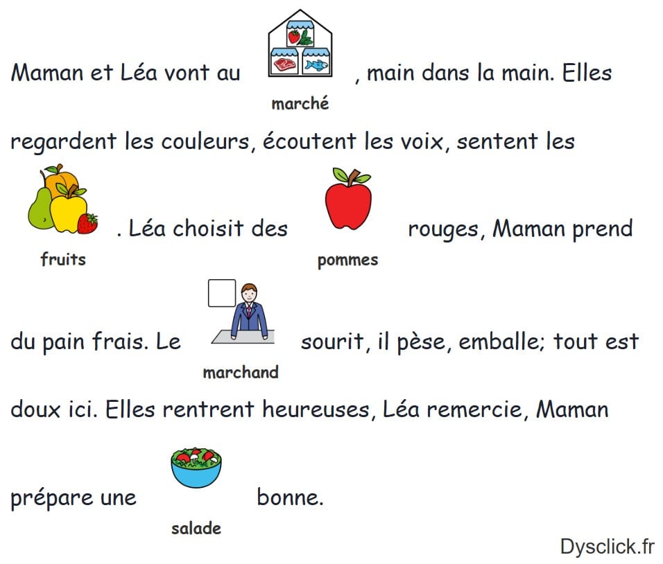 Les mots “marché”, “fruits”, “pommes”, “marchand” et “salade” sont remplacés par des pictogrammes.