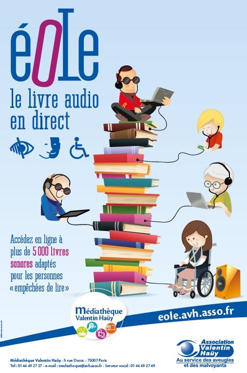 Le service Éole est la bibliothèque numérique de la Médiathèque Valentin Haüy. Il propose plus de 75 000 titres au format audio, braille ou DAISY et met gratuitement ces ouvrages à disposition des personnes malvoyantes, aveugles ou ayant un trouble de la lecture . Selon l’Association APEDA, environ 8 000 de ces titres sont au format “Full DAISY voix de synthèse” : ces ouvrages synchronisent texte et audio pour permettre de suivre le texte pendant l’écoute . L’adhésion est gratuite mais nécessite un justificatif de handicap ou de trouble DYS. Les livres peuvent être téléchargés immédiatement ou envoyés gratuitement sur CD. Les enregistrements en voix humaine offrent une qualité comparable à celle des bibliothèques sonores; les titres Full DAISY utilisent des voix de synthèse pour proposer une lecture simultanée du texte.