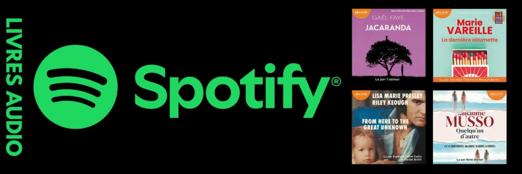 Depuis fin 2024, Spotify intègre des livres audio dans ses abonnements Premium. Les utilisateurs Premium individuels, Duo (gestionnaires) ou Family (gestionnaires) reçoivent 12 heures de livres audio par mois ; une fois ce quota épuisé, ils peuvent acheter un supplément de 10 heures pour 9,99 €. Spotify revendique plus de 200 000 titres dans son catalogue mondial, dont environ 15 000 titres en français. Les heures inutilisées ne sont pas reportées au mois suivant. L’écoute est possible sur toutes les plateformes (PC, Android, iOS) mais les fichiers ne sont pas téléchargeables hors connexion.