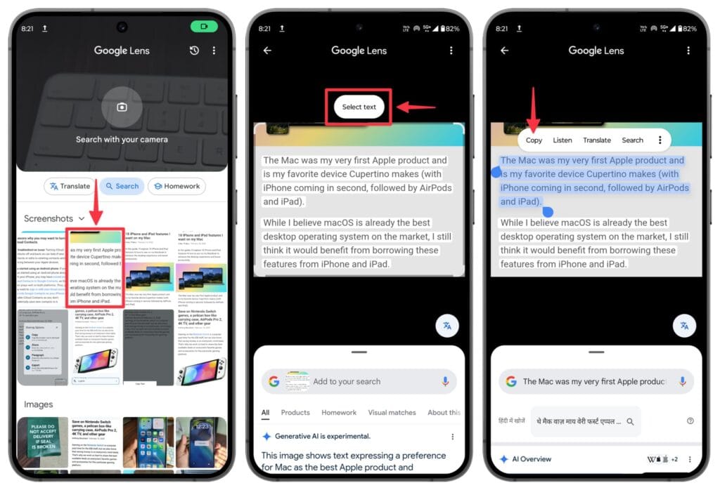 Si ton objectif n’est pas de créer un PDF mais juste de récupérer du texte, Google Lens est souvent la solution la plus rapide. Tu prends la photo, tu passes en mode Texte, Lens extrait le contenu en quelques secondes, puis tu peux copier-coller ou envoyer le texte vers ton ordinateur si ton compte Google est connecté sur les deux appareils.