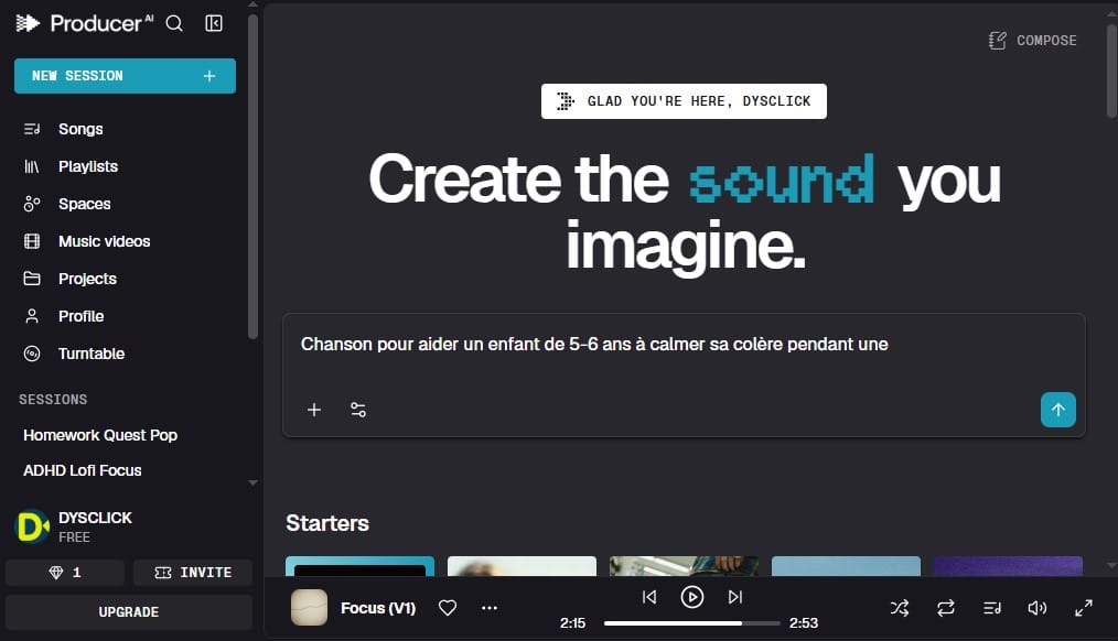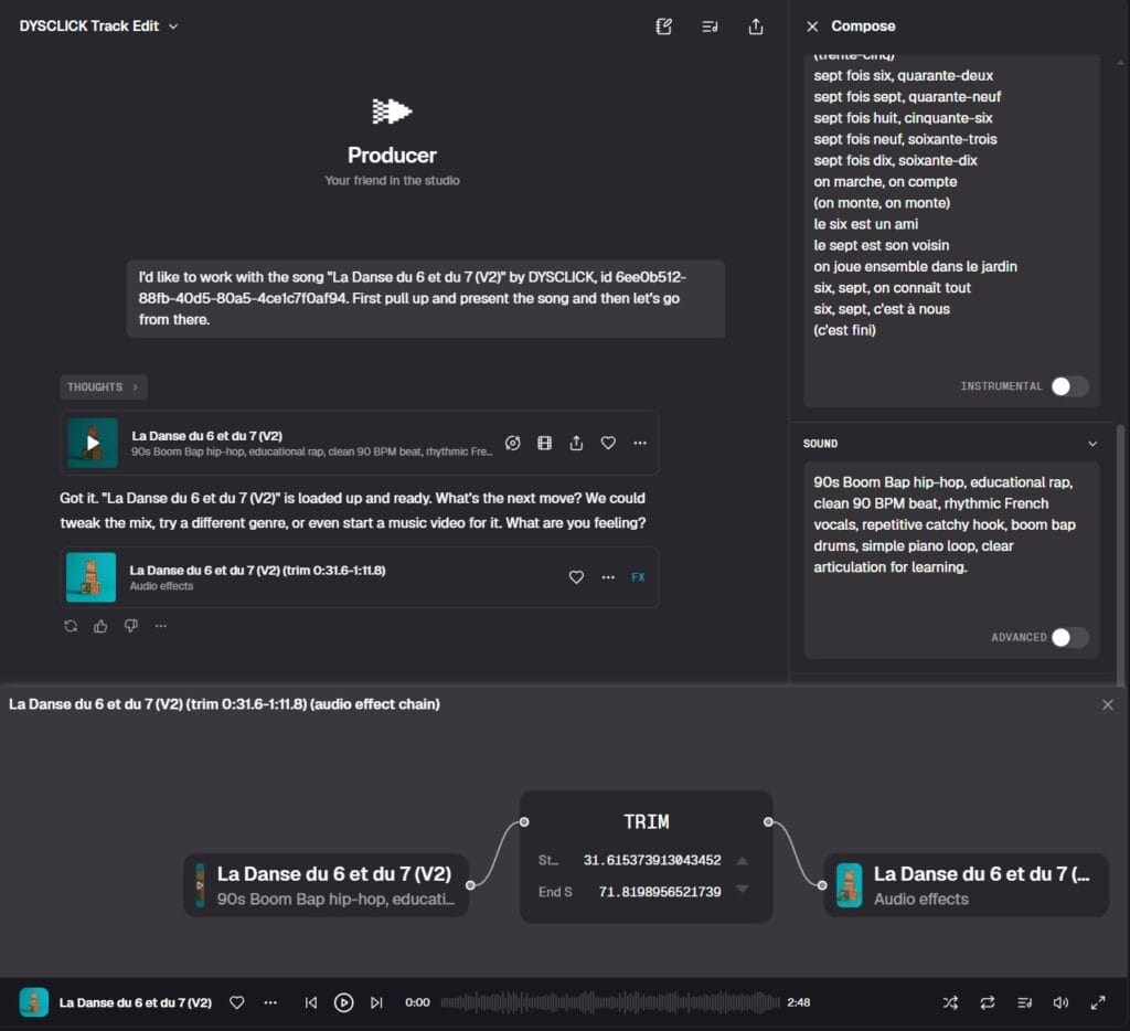 - l’enfant dicte une idée, tu la reformules, ProducerAI la met en chanson, puis vous réécoutez et vous corrigez ensemble.