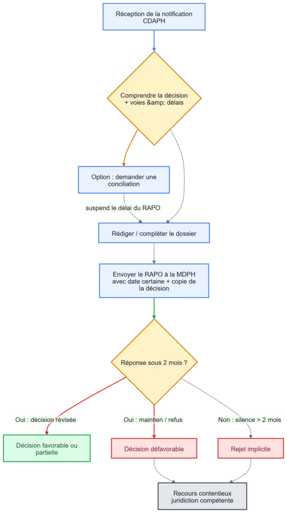 | RAPO | Demander un réexamen formel de la décision | Parents → MDPH → CDAPH | Envoyer avec date certaine ; silence 2 mois = rejet | Lettre motivée + copie décision + éléments probants |
