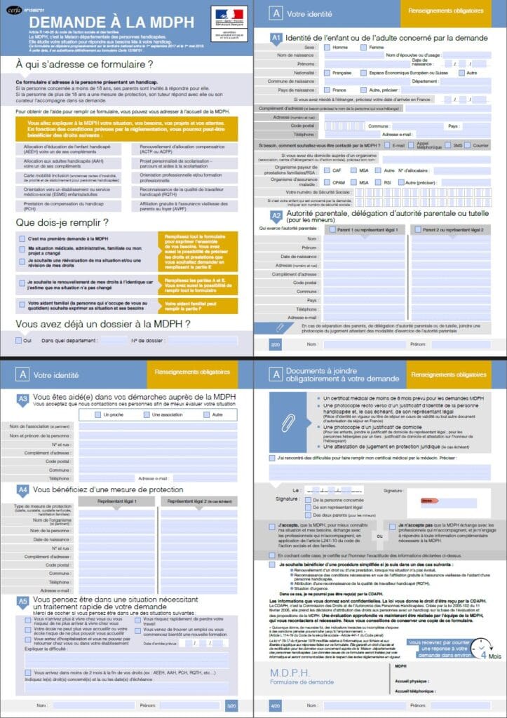- Formulaire de demande MDPH ( Cerfa 15692*01 ) dûment complété, daté et signé.