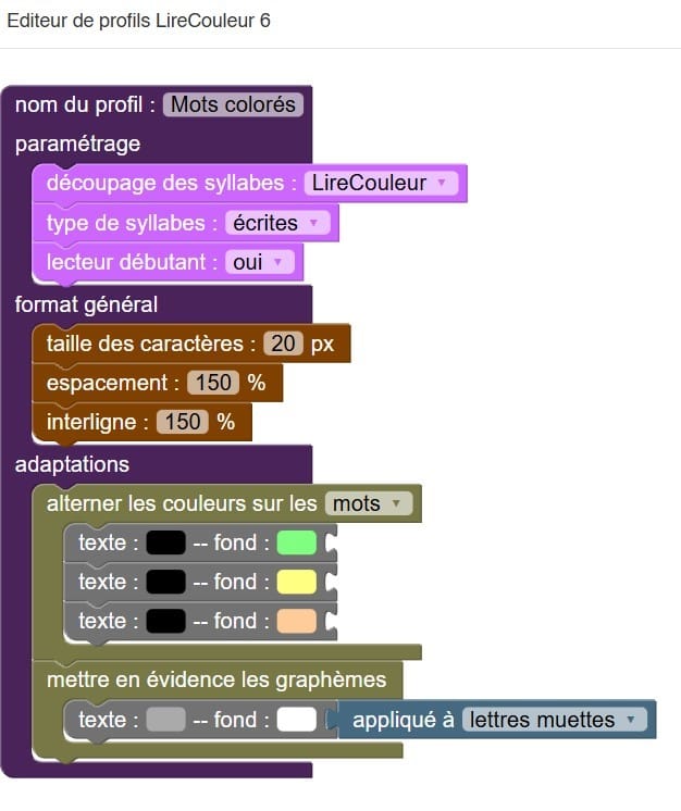 LireCouleur propose aussi un éditeur de profils basé sur Scratch. Oui, ça peut être rebutant au début, surtout si on veut juste un bouton magique. Mais c’est justement ce qui le rend très puissant. Une fois que tu as compris la logique, tu crées un profil vraiment sur mesure, et tu gagnes énormément de temps.