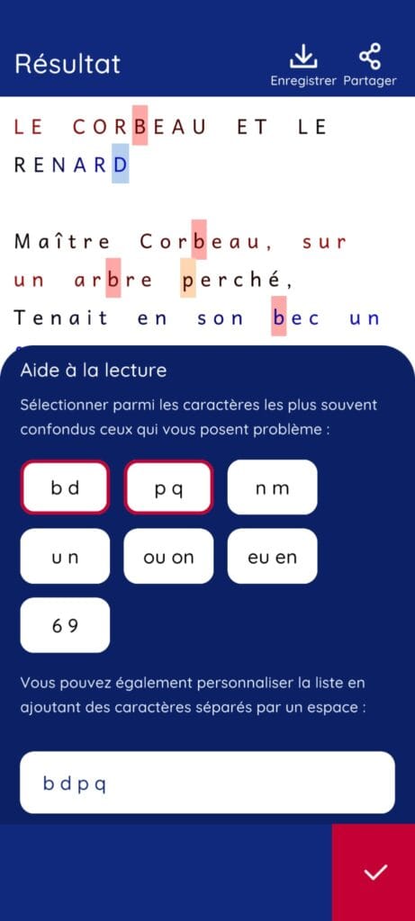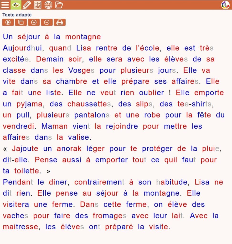 - Mise en couleur des phonèmes et des syllabes pour rendre le texte plus intuitif et facile à déchiffrer.